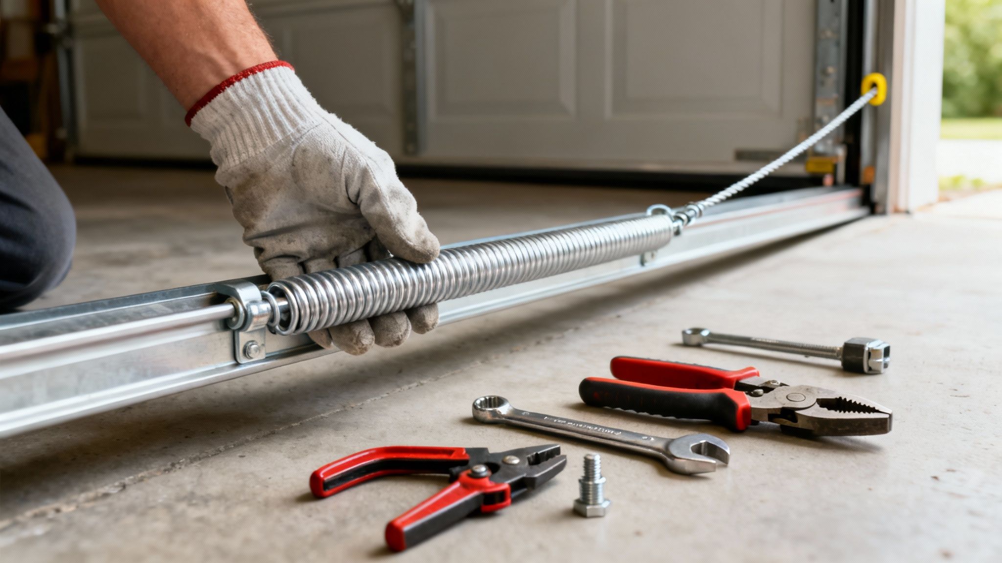 Trying to replace an extension spring without the right tools is a bad idea. This isn't just about making the job easier—it's about staying safe. Take a few minutes to gather everything you need before you start so you aren't stuck on a ladder trying to find a wrench.